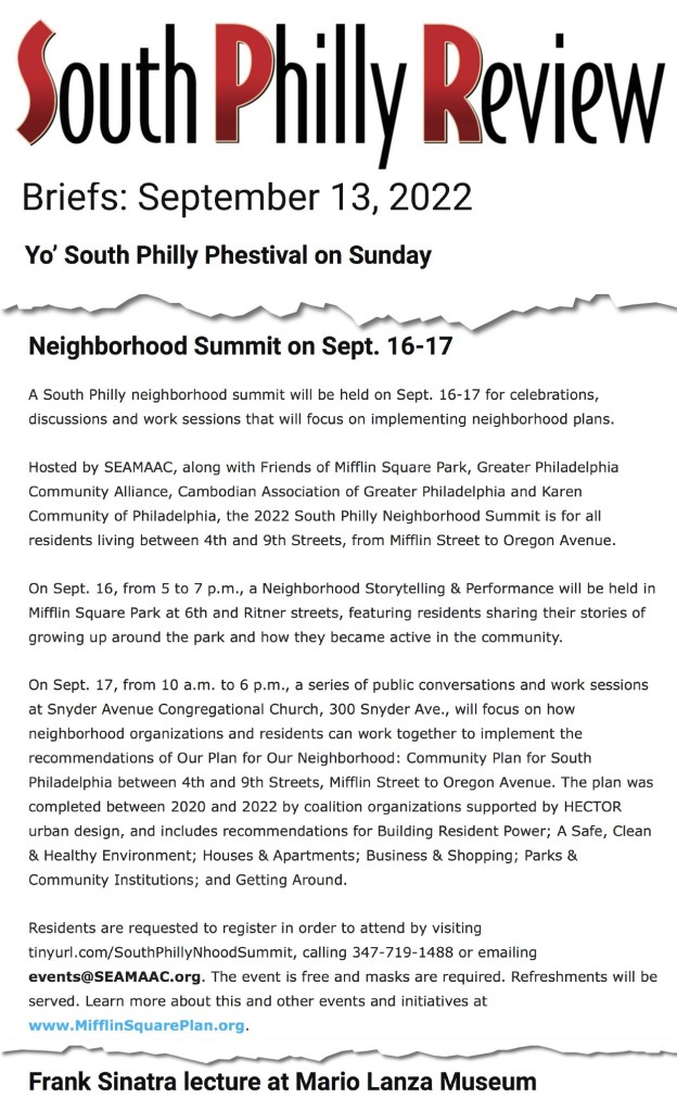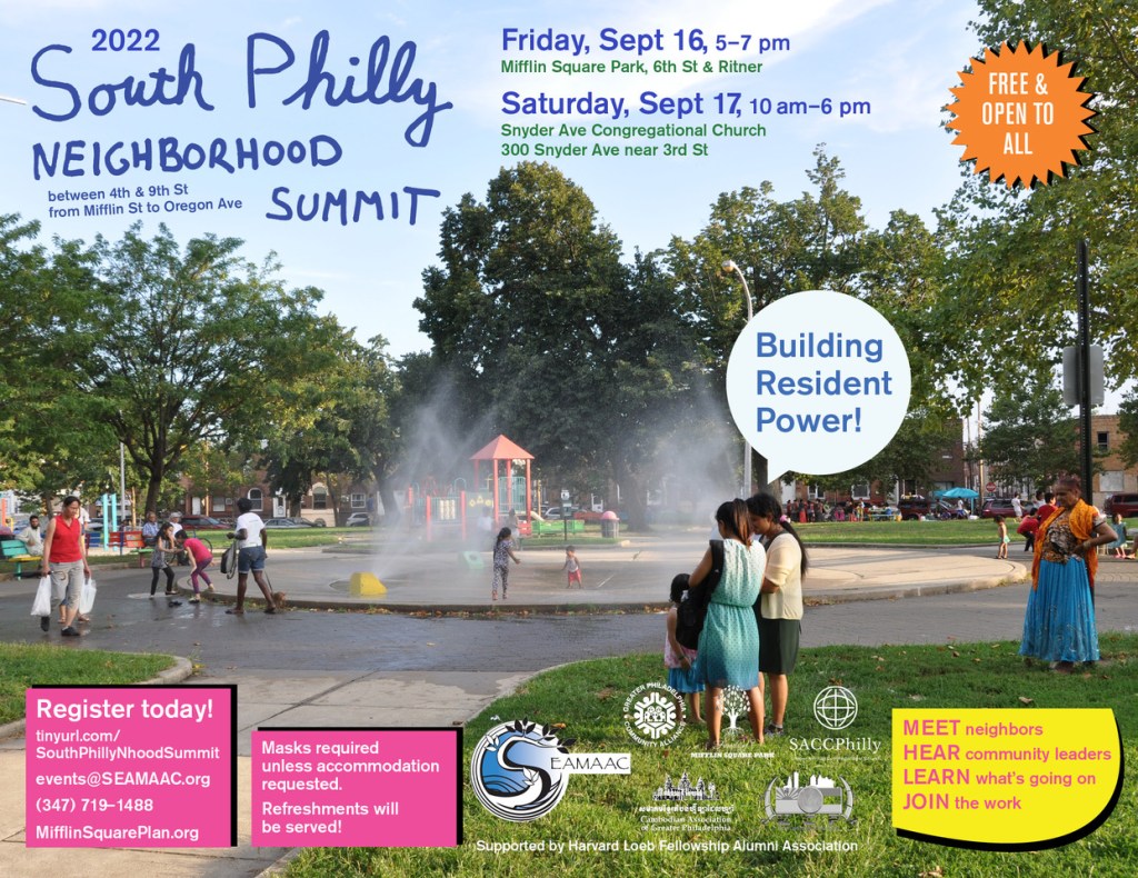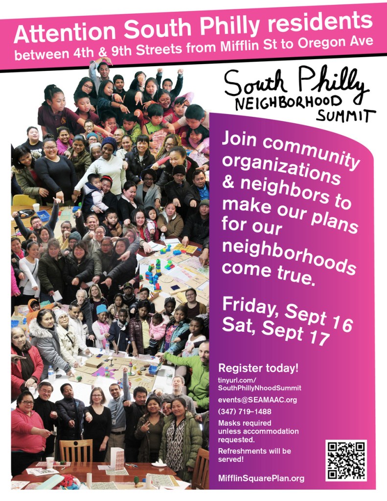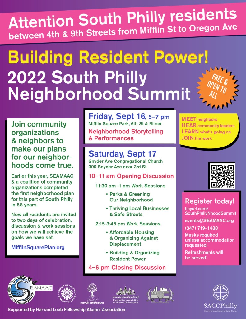 South Philly residents and organizations concluded the 2022 South Philly Neighborhood Summit for 4th to 9th Sts from Mifflin St to Oregon Ave on Saturday, September 17, after two days of celebration, discussion, and work sessions. Residents and organization staff strengthened relationships and committed to next steps for putting neighborhood improvement plans into action, including Our Plan For Our Neighborhood completed in 2022 by a coalition convened by SEAMAAC including Friends of Mifflin Square Park, Greater Philadelphia Community Alliance, Cambodian Association of Greater Philadelphia, and Karen Community of Philadelphia. The Summit was organized by SEAMAAC and Resident Conveners Erme Maula & Rex Yin, in collaboration with HECTOR urban design, with the support of the Harvard Loeb Fellowship Alumni Council.