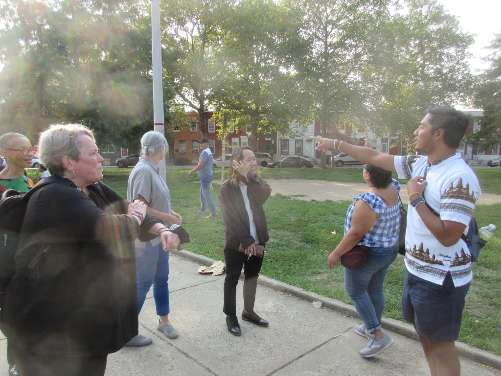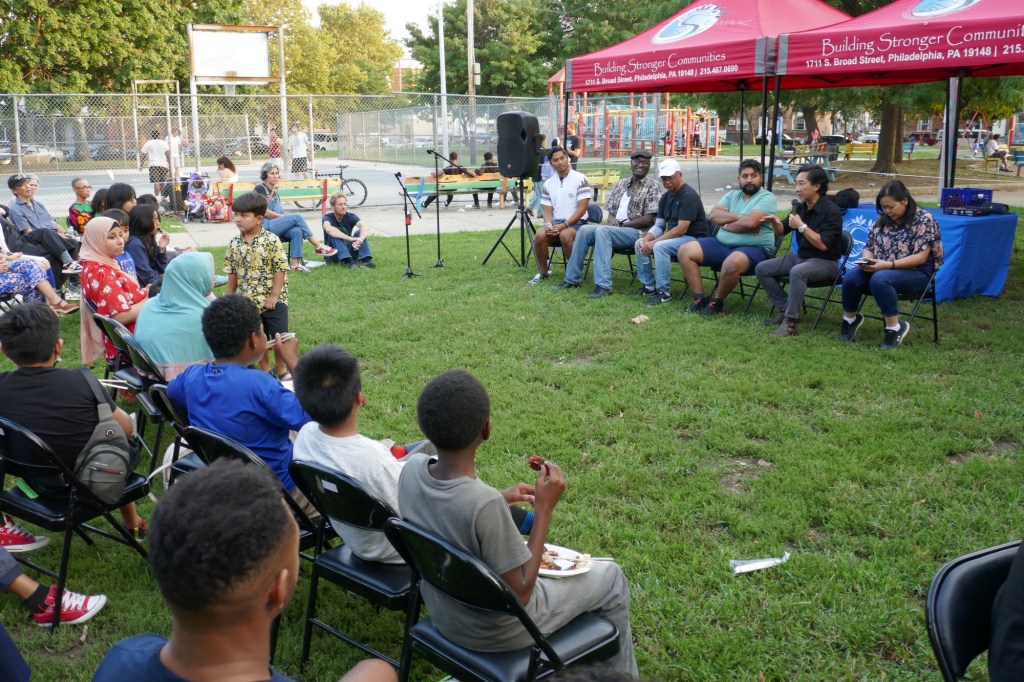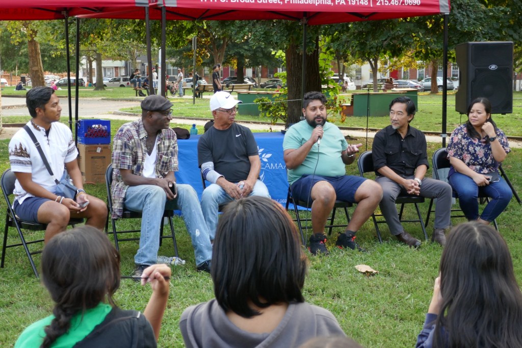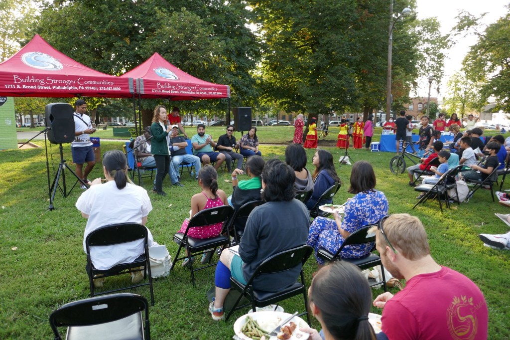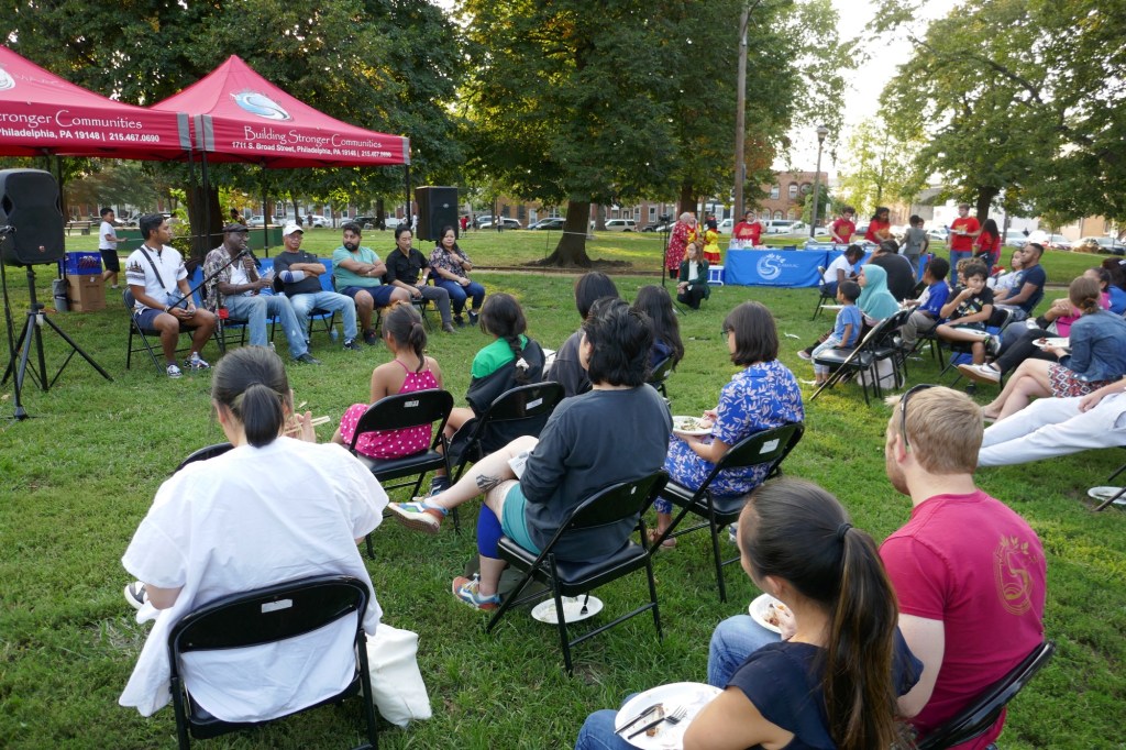 Friday evening in Mifflin Square Park at 6th and Ritner, six South Philly residents shared stories and lessons learned from growing up in this part of South Philly. Moderated by Resident Convener and CAGP Board Member Rex Yin, storytellers included 7th Street business owner Zak Aslam, Dickinson Square West Board President John Dizzley, SEAMAAC Executive Director Thoai Nguyen, Nacho Perez from Murphy Rec Center, and ZarZo, who also prepared the Burmese food enjoyed by all. (Stay tuned for a recording of South Philly Stories to be broadcast on Philadelphia Community Access Media.) The event concluded with a dance performance by Modero & Company, whose mission is “preserving the traditional Indonesian culture through dancing, food, events and other experiences for the South Philly’s Indonesian community as well as the greater Philadelphia public.”