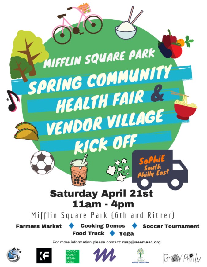 On Saturday, April 21, 11 am— 4 pm, come to Mifflin Square Park for the Spring Community Health Fair & Vendor Village Kick Off, featuring a Farmers Market, Cooking Demos, Soccer Tournament, Food Truck & Yoga! You’ll also be able to see & ask questions about the Mifflin Square Park Concept Design.