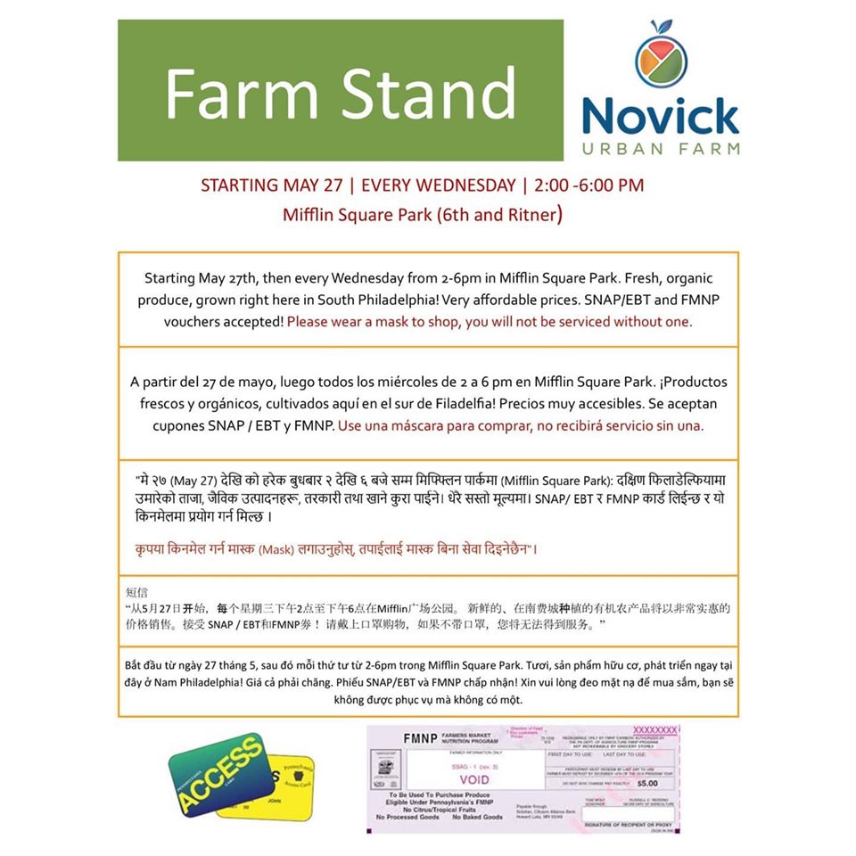It’s almost summer, which means it’s time to welcome back our partners at Novick Urban Farm! Novick will host its farmstand in Mifflin Square Park every Wednesday from 2-6pm through the summer.