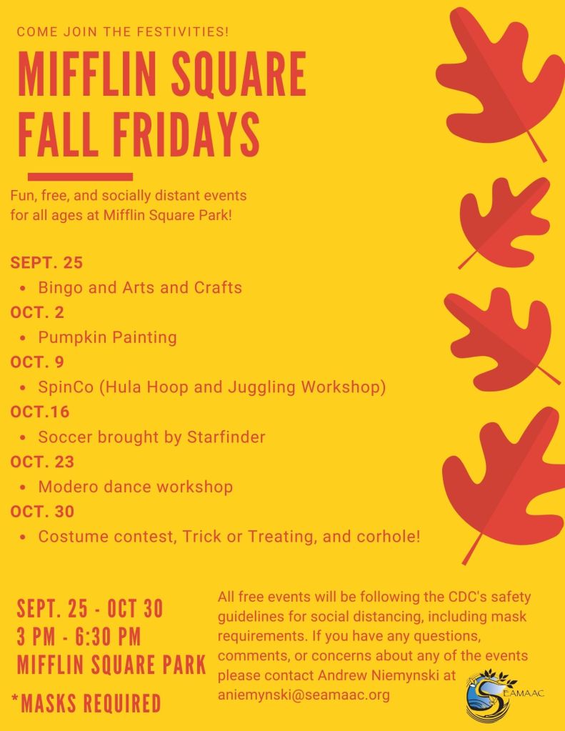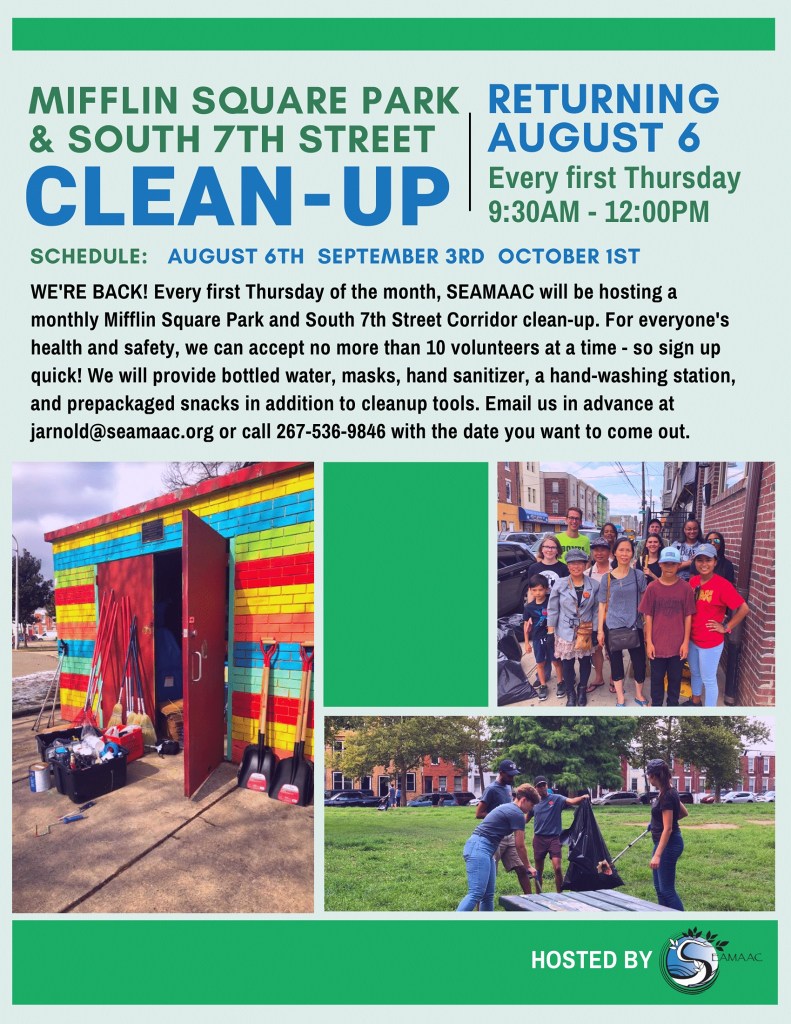 - Residents and organizations want to lock in funding to complete reconstruction of Mifflin Square Park according to the “Making Room For Everyone” design, including committed $750,000 from National Parks Service ORLP program and promised one-to-one local match, and potential new funds available from the Parks and Outdoor Recreation Program of the Pennsylvania Department of Conservation and Natural Resources. Led by SEAMAAC and Friends of Mifflin Square Park, they will renew communication and advocacy with all involved parties while seeking additional resources to complete the approximately $5 million project.