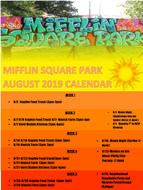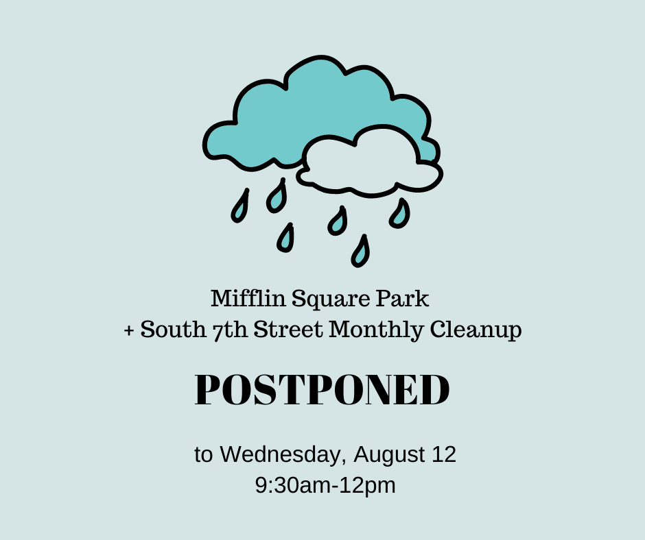 Due to impending thunderstorms this morning, the Monthly Cleanup on 7th Street and Mifflin Square Park will be postponed to next Wednesday, August 12th, from 9:30am to 12pm. Hope to see you there!