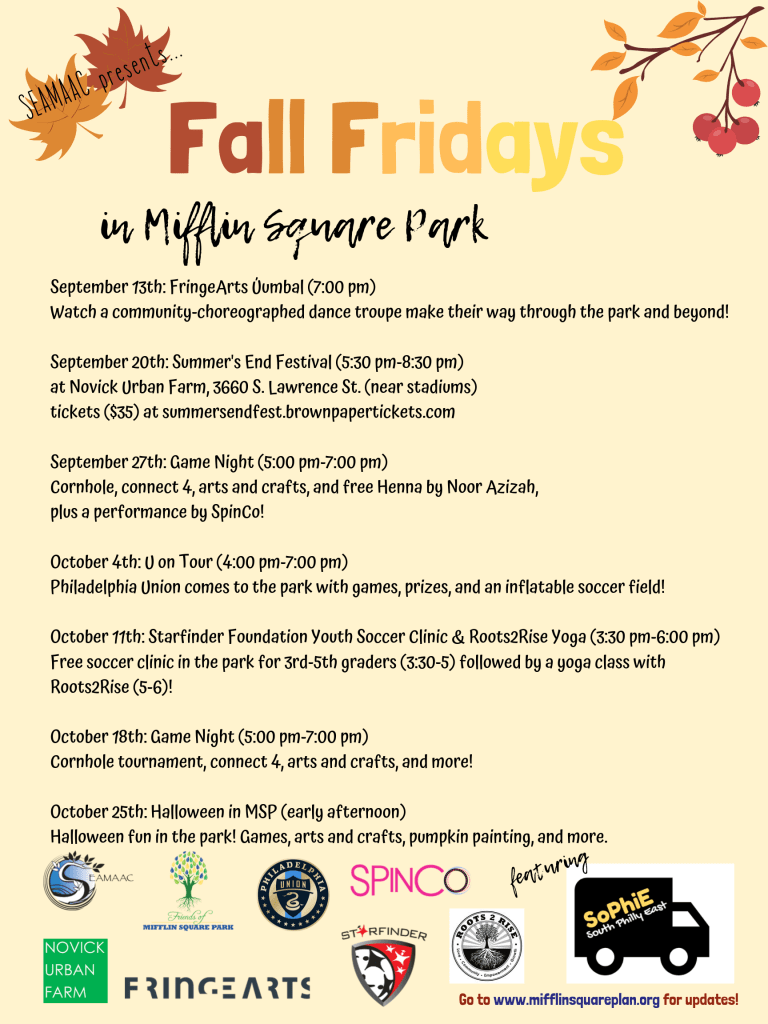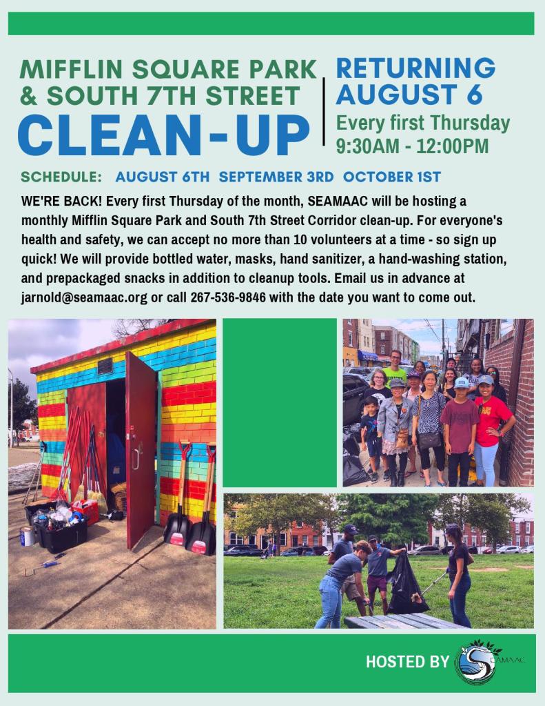 Thank you to the friends and neighbors of Mifflin Square who came out to the monthly park and neighborhood cleanup on Wednesday, August 12th! The park and South 7th Street are much cleaner for everyone’s effort. The next cleanup will be September 3rd from 9:30am-Noon. Spots are limited to ensure social distancing so please email jarnold@seamaac.org or call 267-536-9846 in advance to sign up!