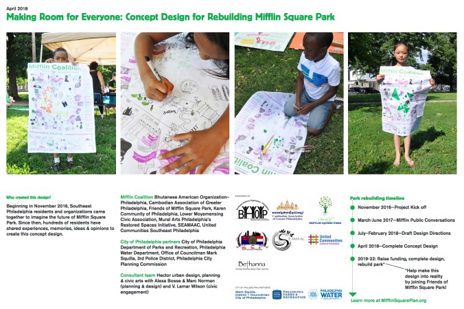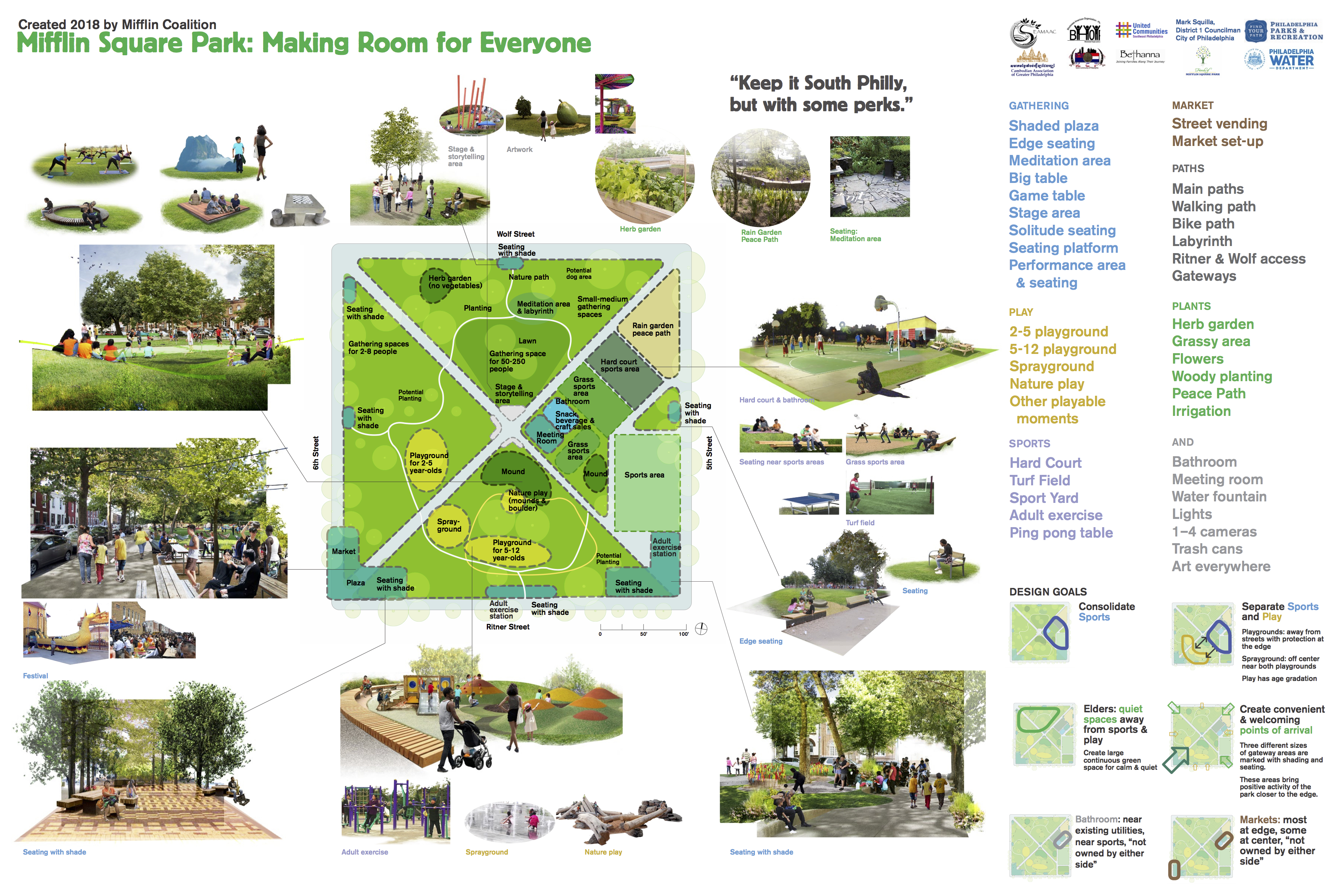 Beginning in January and February of 2021, the Philadelphia Water Department will be starting construction on the Mifflin Square Park Green Infrastructure Project, continuing throughout 2021. This project will rebuild each of the 4 corner entrances to the park, install a rain garden near the 5th and Wolf corner, and build a seating plaza at the corner of 6th and Ritner with a design that community members developed in 2019.