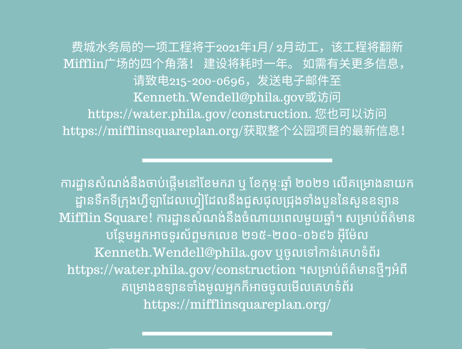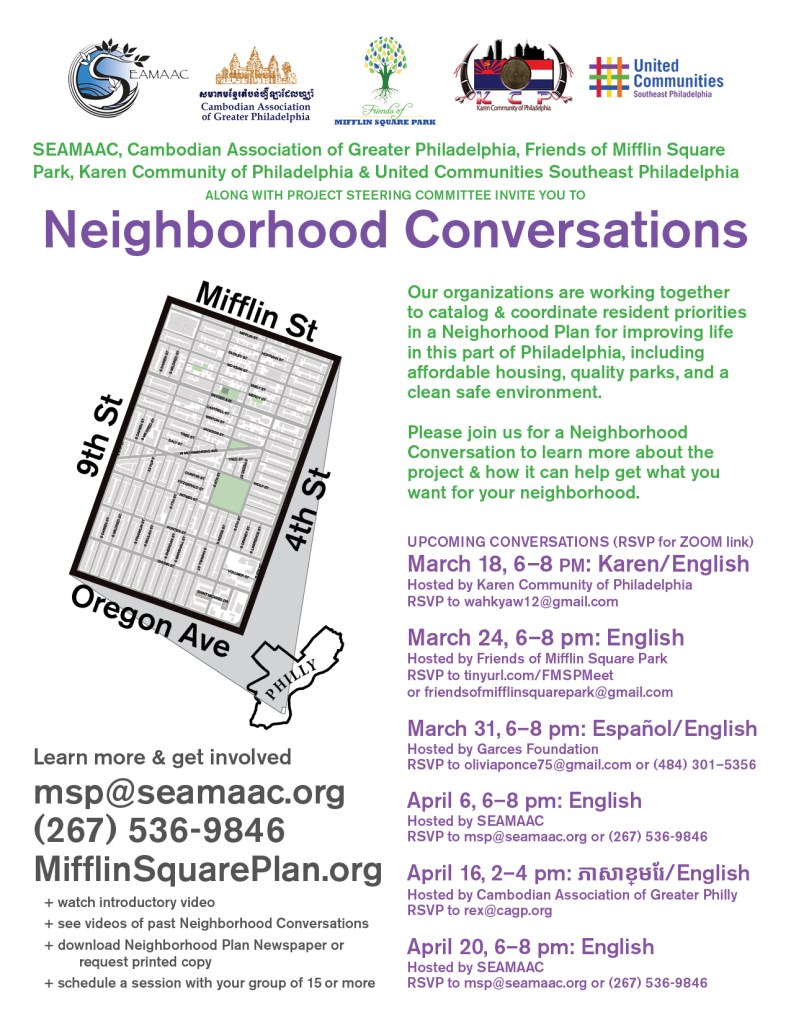 Several neighborhood groups have already hosted neighborhood conversations! Dozens of residents have joined the Karen Community of Philadelphia, the Friends of Mifflin Square Park, the Garces Foundation, and SEAMAAC in discussions. There are still two more conversations scheduled: One on April 16th hosted by the Cambodian Association of Greater Philadelphia and one on April 20th hosted by SEAMAAC. You can sign up at the emails below and if you or your neighbors are interested in hosting an additional conversation, please reach out to msp@seamaac.org or call 267-536-9846.